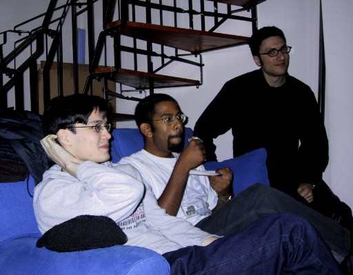 Kim, Lal and Eccles look on in bemusement as I set up the Dance Dance Revolution infrastructure. Lal, beginning as he means to go on, has already some kind of food or beverage in his hands.